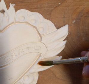 Verrà poi ingobbiato, cotto a biscotto una prima volta ed in fine smaltato.