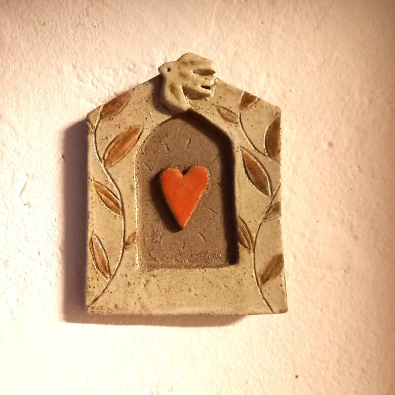 Little wall pieces feelings of freedom, travel, love, lightness, peacefulnessunique - stonware(nail hole backside)- red heart with bird: 11,5cm x 9 cm.