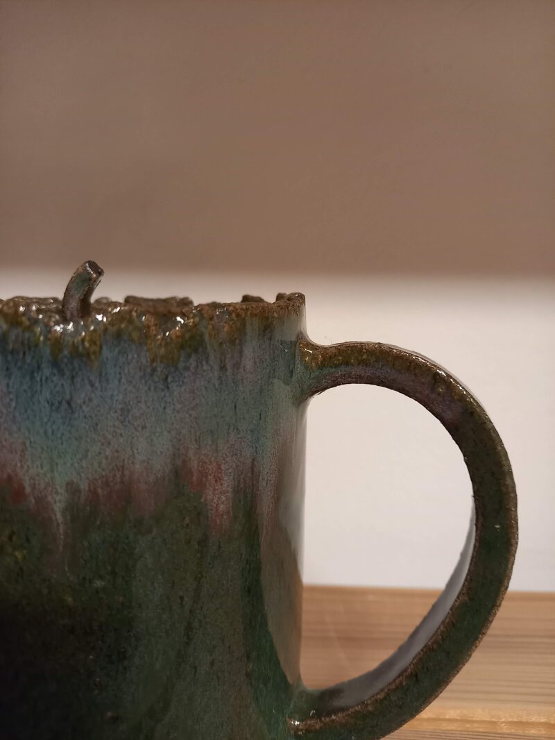 Gres alta temperatura. Il nome, volutamente storpiato, proviene dal mio smalto verde, striato di rosso granato.