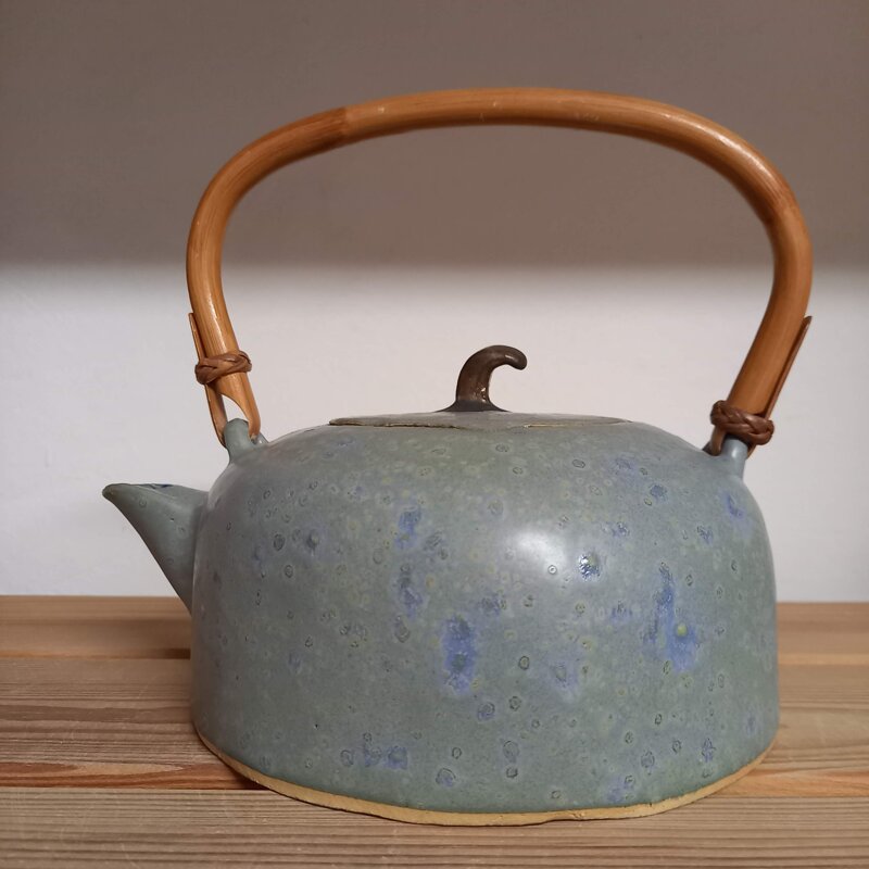 Chamotted stoneware, light blue matte glaze with cobalt cristal, bamboo handle.